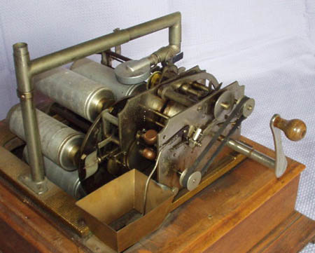 This phonograph allowed the playing of each of 6 cylinders when placed in a special housing. (Collection of P. Caluwé) [editors note: looks like a coin-op mechanism, source http://www.phonograph.be/paginas/31.Thorens.htm]