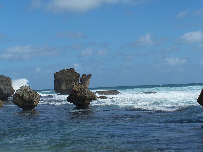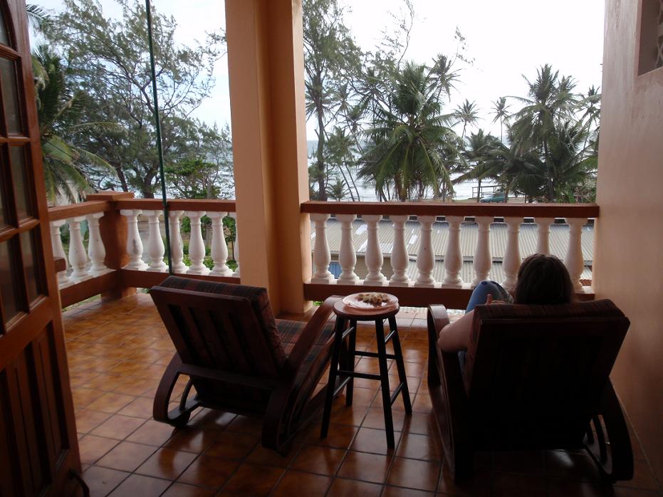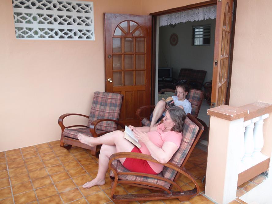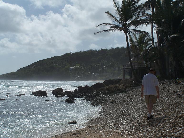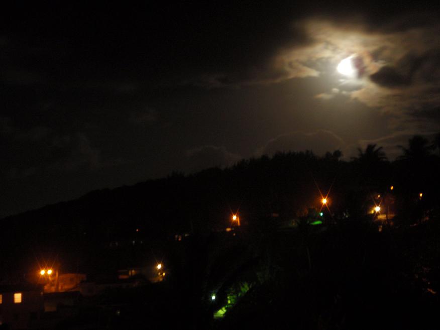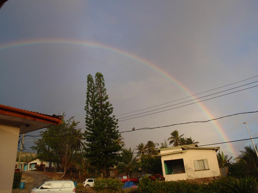 We would drag the dinning room table out for dinner each night--don't tell Dorothy. Moonrise. The wild, east coast beach. North of here is a famous spot for surfing. Dorothy's garden is looking good. Early morning horizon-to-horizon rainbow. It was most comfortable to sleep on the floor at the front of the house as the constant trade-wind blew through the house. |