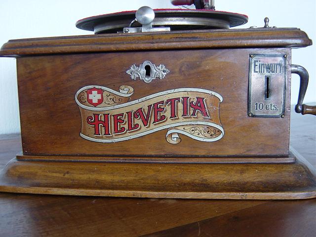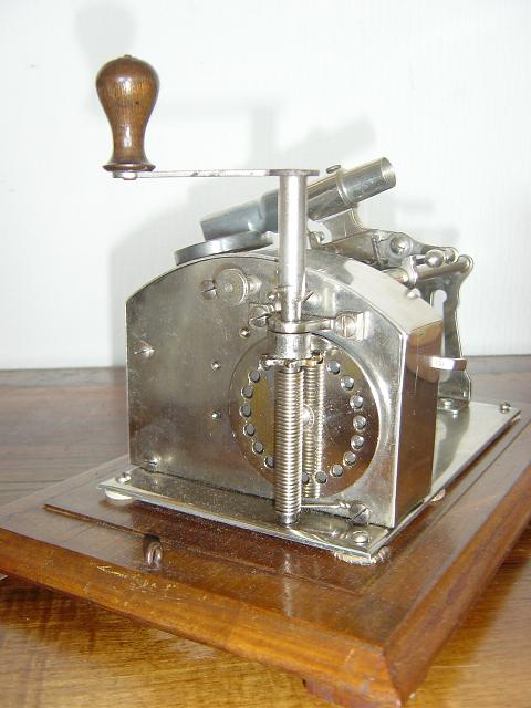 This phonograph allowed the playing of each of 6 cylinders when placed in a special housing. (Collection of P. Caluwé) [editors note: looks like a coin-op mechanism, source http://www.phonograph.be/paginas/31.Thorens.htm]
